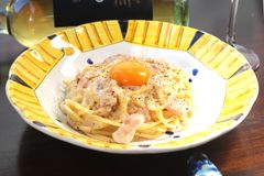 <卵黄を加えて仕上げるチーズたっぷりカルボナーラ>