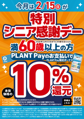 特別シニア感謝デーは、満60歳以上のお客様を対象としてPLANT Payでお支払いをいただくと本体価格の10%をPLANT Pay限定ボーナスで還元するキャンペーンとなっております。
