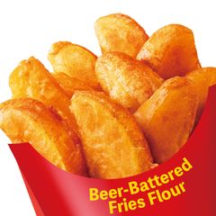 『ビアコーテッドポテトの素』は、乾燥ビール酵母(※)の旨みに、ローストガーリックのコクと黒こしょうでアクセントを付けたフライドポテトの素です。コク旨醤油の味付けで、塩やケチャップなどが要らず、そのまま食べられます。くし切りにし、電子レンジで加熱したじゃがいもに、水で溶いた本品をつけて揚げるだけで、外食店のようなカリカリ食感とサクサク・ホクホク感のフライドポテトが手軽に楽しめます。「キタアカリ」や「男爵」がお薦めのじゃがいも品種です。また、マッシュルーム、ズッキーニ、かぼちゃ、れんこんなどの野菜でもお楽しみいただけます。