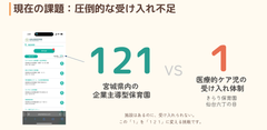 私たちの調査では、県内に121園ある企業主導型保育園(主に0~2歳児の受け皿となる施設)のうち、現在この年齢の医療的ケア児を受け入れている既存の施設は、私たちの「きらり保育園 仙台六丁の目」わずか1園のみである可能性が高いことがわかりました。(※2026年1月 当プロジェクト調べ。根拠・参考サイト:こども家庭庁主幹 企業主導型保育園検索サイト)参照。宮城県を選択、詳細検索で医療的ケア児にレ点を入れて検索してください。