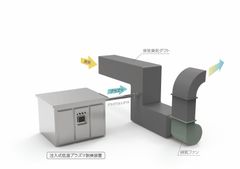 対して「ネオプラズ」は、装置内で生成したプラズマ放電ガスのみを排気ダクト内へ送り込む「注入式(間接反応方式)」を採用しています。