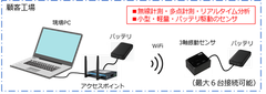 小型・軽量のバッテリ駆動センサとパソコンをWi-Fi接続し、配線なしで振動計測が行えます。