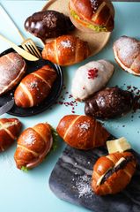 明太子をたっぷり使った特製明太マヨを、焼き立ての塩パンにたっぷりサンド。香ばしい海苔をトッピングしました。