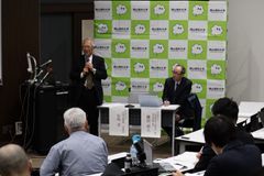 記者会見する石垣名誉館長(左)と藤田館長(右)