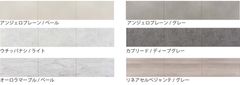 ラインナップは、アンジェロプレーン/ペール、アンジェロプレーン/グレー、ウチッパナシ/ライト、カプリード/ディープグレー、オーロラマーブル/ペール、リネアセルべジャンテ/グレーの全6種。