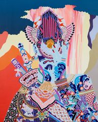 京森氏は、装飾やシンボルを通して人間の欲望や権威の構造を描き出す作品で注目を集めています。宗教美術や歴史的な装飾文化から着想を得ながら、鮮やかな色彩と緻密な構成、そして独自の素材表現を組み合わせることで、強い視覚的インパクトを持つ作品を制作しています。エルメス主催のアートアワードでの受賞をはじめ、その独創的な表現は国内外で高く評価されています。