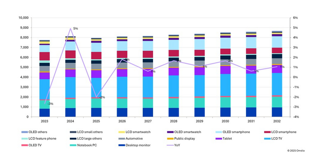 「2025年の減少は、技術的および経済的要因の2つの主要因によって引き起こされています」とオムディアのシニアアナリストであるクイーニー・ジャンは述べています。「より効率的なデュアルレート駆動やトリプルレート駆動の採用拡大が大型ディスプレイ分野でのDDIC需要を押し下げている一方で、消費者向け電子機器市場全体は、不安定な関税政策や厳しい世界経済状況により、不透明な見通しに直面しています。」