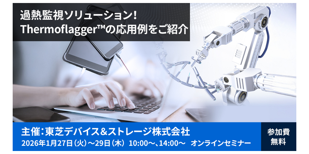 川崎--(BUSINESS WIRE)--(ビジネスワイヤ) --東芝デバイス&ストレージ株式会社は、1月27日(火)から29日(木)の3日間、「過熱監視ソリューション!Thermoflagger™ の応用例をご紹介」 と題し、無料Webセミナー(ウェビナー)を開催します。