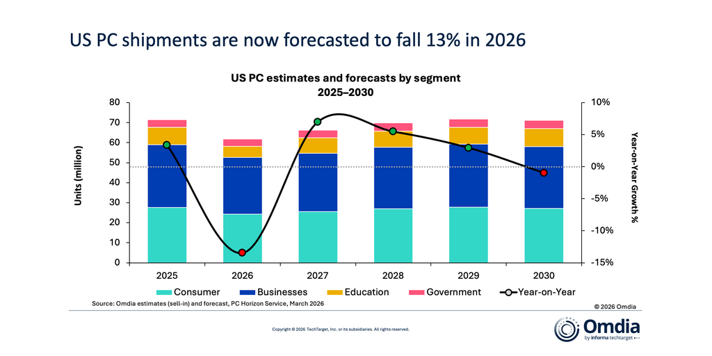 オムディアは、米国PC出荷台数が2026年に13%減の約6,187.7万台となり、その後2027年には緩やかに回復すると予測している。
