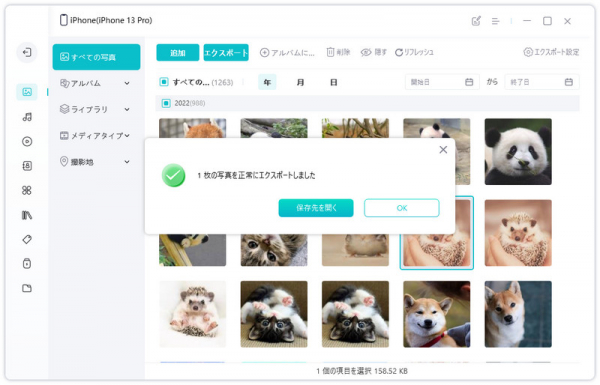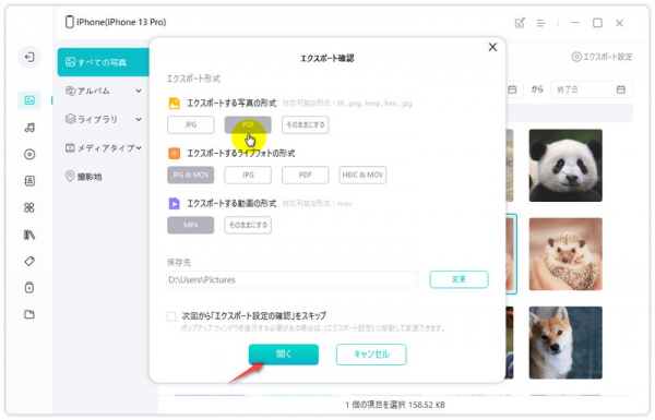 step1:iCareFoneを起動し、今までのiPhoneをパソコンに接続します。パソコンに転送したい写真や画像を選んで、オプションバーで「エクスポート」をクリックします。※右側の「エクスポート設定」ボタンを押すと、写真(画像)の出力形式を設定することができます。対応可能な形式:tif、png、bmp、heic、jpg