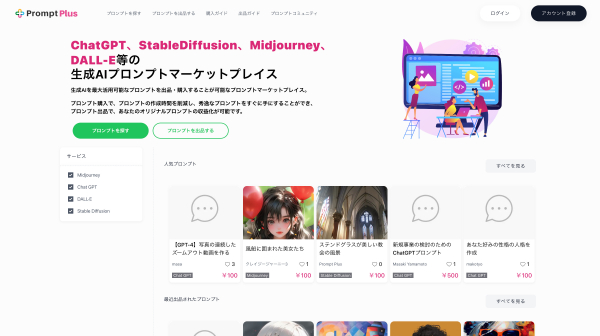 Prompt Plusでは多くの高品質なプロンプトを取り扱っており、ChatGPTでうまく答えを引き出すためのプロンプトや、Stable DiffusionやMidjourney等を通してアニメのような画像を生成するプロンプトなどを簡単に手に入れることができます。