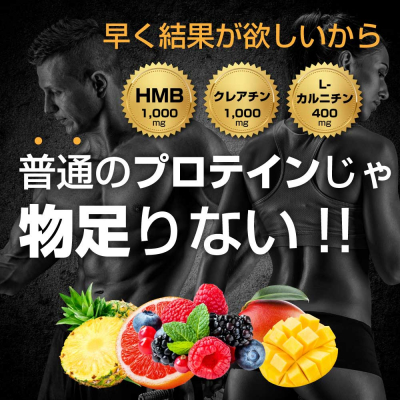 様々なプロテイン販売される中、消費者がもっとも不満に感じているのが、「味」と「効果の実感」でした。そこでそれらを解消するために美味しさを追求した結果、本物の果実に辿りつきました。また効果を実感しやすくするために、筋細胞の増殖を促進する「HMBカルシウム」、多くのオリンピックメダリストが使用していたことで話題になった、筋力を最大化する「クレアチン」、脂質の代謝を高める「L-カルニチン」を有効量配合しました。これらの成分は、国際スポーツ栄養学会でも非常に安全性に優れた成分とされています。