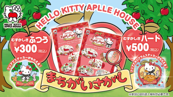 参加者は、受付にて渡される“まちがいさがしキット”と、施設内の360度シアターに映し出されたハローキティの可愛い イラストを照らし合わせ、隠された間違いを探し出します。全て見つけ出すと、「HELLO KITTY APPLE HOUSE」のオリジナルステッカーをプレゼント。難易度は“ふつう”と“ハード”の2種類をご用意しています。小さなお子さまから大人の方まで、年齢問わずお楽しみいただけるイベントです。