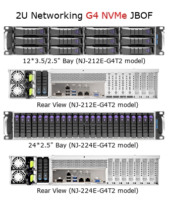 Gen4 NVMeデバイスが12台接続可能なNJ-212E-G4T2モデル、24台接続可能なNJ-224E-G4T2モデルとNJ-224R-G4T2モデルが可能で、U.2-M.2アダプタの使用でM.2 SSDも利用できます。
