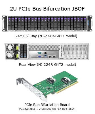 NJ-2xxx-G4T2 Networking JBOF(Just a Bunch Of Flash)シリーズは、UEFI BIOSのPCIeバス分岐(PCIe-Bifurcation)機能と、PCIe Bifurcationカードにより、AMD EPIC 7003/7002 CPUのPCIe Gen4インターフェイスから、SlimSASコネクター(SFF8654)を用いて12系統 または 24系統の(X4)レーンバスを引き出し、Gen4 NVMe SSDに接続する2U JBOFストレージです。
