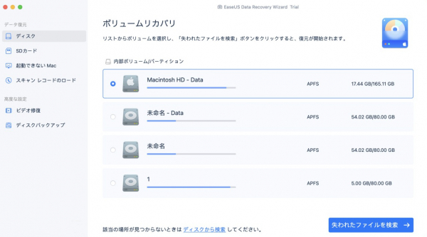 Step 1.EaseUS Data Recovery Wizard for Macをインストールして起動します。お持ちの外付けSSDをMacに接続して、「ボリュームリカバリ」で確認してから、「失われたファイルを検索」ボタンを押します。