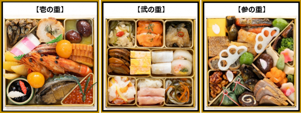 いくら醤油漬けつくばね、黒糖焼豚、鶏の巴巻き、叩き牛蒡、田作り、鮑柔らか煮、黒豆紅白ちょろぎ、数の子、有頭海老艶煮、伊達巻、紅白蒲鉾、栗渋皮甘露煮、黄金きんとん、金柑蜜煮