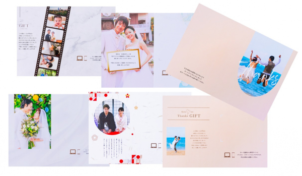 「おしゃれに、手軽に、簡単に」をコンセプトに、デザイン未経験の方でも簡単にオリジナルの引き出物がつくれるようにテンプレートを用意しました。写真の差し替えやメッセージの変更だけで、世界にひとつの引き出物を作成できます。