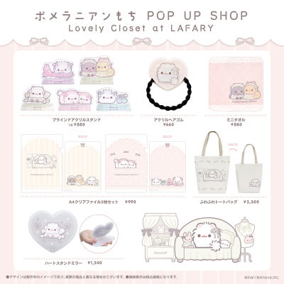 今回のPOP UP SHOPのテーマは「Lovely Closet」。おめかししたポメラニアンもち達を作者のmalが本催事用に描き下ろし。描き下ろしイラストを使った新商品やぬいぐるみ、Z世代女子に人気のブランド「LAFARY」とコラボした推し活グッズも多数発売!