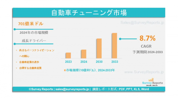 Surveyreportsの専門家は、カーチューニング市場の調査を分析し、2024年にカーチューニング市場規模が701億米ドルに達すると予測した。さらに、自動車チューニング市場のシェアは、2033年末までに1516億米ドルに達すると予測されている。自動車チューニング市場は、2024年から2033年の予測期間にわたって、年間平均成長率(CAGR)約8.7%で成長すると予測されている。