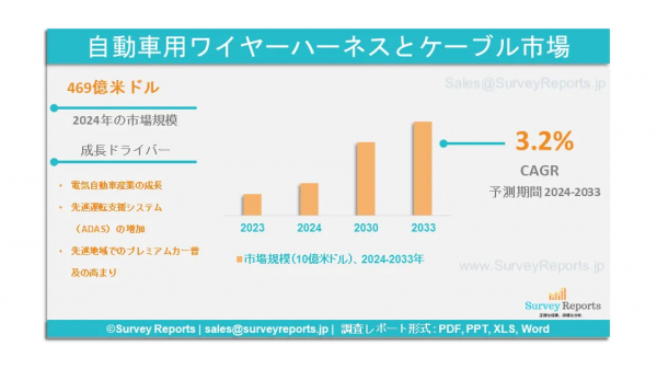 Surveyreportsの専門家は、自動車用ワイヤーハーネスおよびケーブル市場の調査を分析し、2024年に自動車用ワイヤーハーネスおよびケーブル市場規模が469億米ドルに達すると予測した。さらに、自動車用ワイヤーハーネスおよびケーブル市場のシェアは、2033年末までに655億米ドルに達すると予測されている。自動車用ワイヤーハーネスおよびケーブル市場は、2024年から2033年の予測期間にわたって、年平均成長率(CAGR)約3.2%で成長すると予測されている。