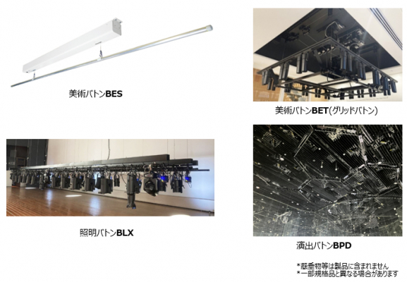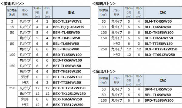 特注品の扱いが多くお客様に分かりにくいと言われるバトンの仕様を見直し、選びやすく導入の検討がしやすいように用途や目的別に、吊り荷重別も様々なバリエーションを豊富にラインアップしています。