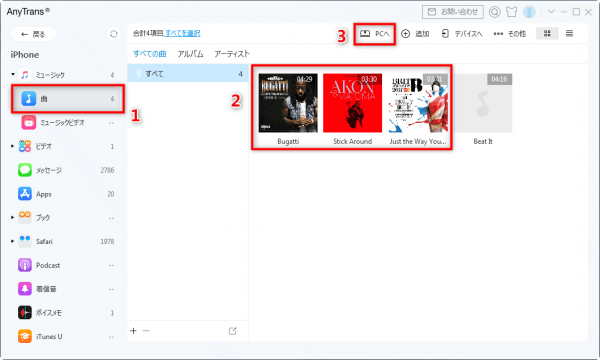Step3:「曲」をクリックしたら、iPhoneに保存している曲が表示されます。すべてか、パソコンに移したい曲を選択し、「PCへ」ボタンをクリックします。