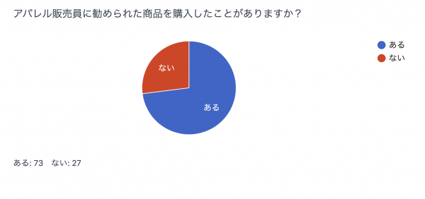 「アパレル販売員に勧められた商品を購入したことがありますか?」のアンケート調査について、「ある」が73%「ない」が27%と約7割の人が購入経験があることが分かりました。