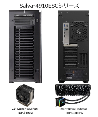 Salva 4910ESCシリーズは、LGA6096ソケット(ソケットSP5)のAMD Zen4 EPYC 9005/9004 CPUを搭載したシステムで、Windows系OS、Linux系OS、仮想化OS環境での動作が確認されています。
