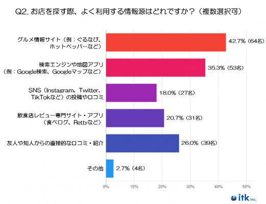 最も多かった回答は、「グルメ情報サイト(例:ぐるなび、ホットペッパーなど)」で42.7%でした。クーポンやジャンル別検索などの機能が充実しており、行きたいお店を見つけやすい点が支持されているようです。