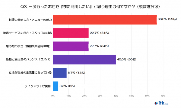 最も多かった回答は、「料理の美味しさ・メニューの魅力」で66%でした。実際に食べてみて「ここならまた来たい」と思わせる味とメニューの多彩さが、リピートの一番大きな動機だと言えます。