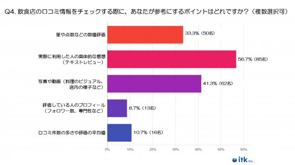 最も多かった回答は、「実際に利用した人の具体的な感想(テキストレビュー)」で56.7%でした。写真や数値評価だけではわかりにくい味やサービスの細かい部分が、生の声から伝わるため、より参考になると考えられます。