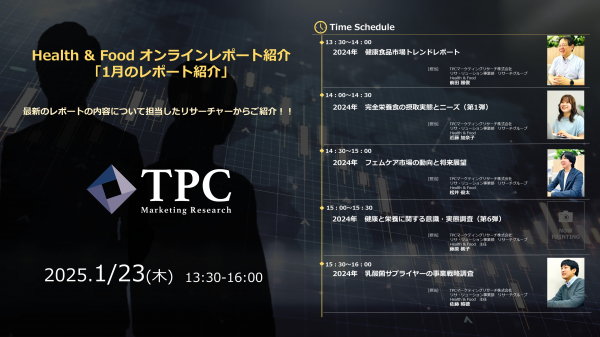 リサ・リューション事業を展開するTPCマーケティングリサーチ株式会社(代表取締役社長:松本 竜馬)は、2025年1月23日にHealth &Foodオンラインレポート紹介「1月のレポート紹介」を開催いたします。