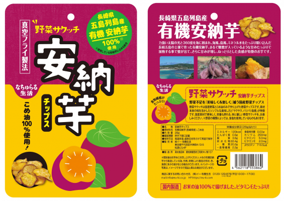 国産野菜を原料としてラインナップをしてきた『野菜サクッチ』シリーズ初の有機原料を使用したチップスです。力強い太陽の光と360度を海に囲まれ、海風、島風、ミネラル水をたっぷり吸い込んだ長崎県五島列島の土壌で育った有機栽培の安納芋を100%使用しております。外見はコロンとした丸い形をしており、味は糖度の高さとねっとりとした食感が特徴です。その安納芋をこだわりのスライス幅にカットし、国産こめ油を使用した真空フライ製法により、素材の美味しさを最大限引き出しました。