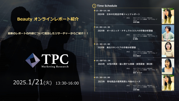 リサ・リューション事業を展開するTPCマーケティングリサーチ株式会社(代表取締役社長:松本 竜馬)は、2025年1月21日にBeautyオンラインレポート紹介を開催いたします。