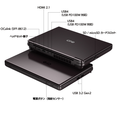 USB PD 急速充電に対応するUSB4端子、HDMI端子だけでなくSD/microSDカードスロットを内蔵することで、大画面モニターやキーボード、マウスと接続してデスクトップPCとして使用したり、各種外部ストレージとの高速データ転送が可能です。本体前面の電源ボタンには指紋センサーが内蔵され、シンプルかつセキュアに起動することができます。