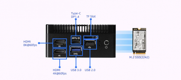 USB 3.0、USB 2.0、Type-C、M.2 E-KEYスロットなど、多様なインタフェースを備えており、Wi-Fi 6/Bluetoothの拡張やTBストレージの容量拡張が可能です。また、M.2 SATA/PCIe NVMe SSD(2242)やTFカードスロットをサポートしており、大量データの保存に対応します。