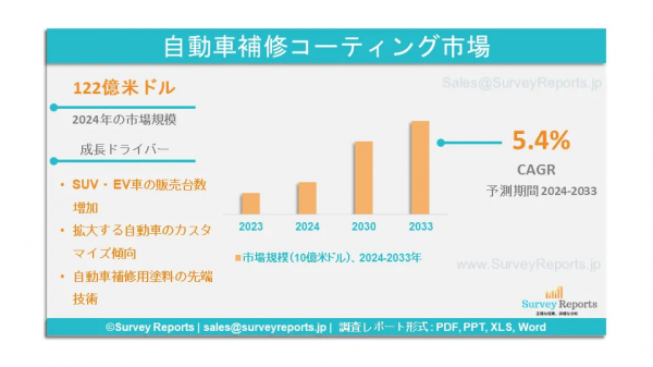 Surveyreportsの専門家は、自動車補修用コーティング剤市場調査を分析し、2024年の自動車補修用コーティング剤市場規模が122億米ドルであることを明らかにしました。さらに、自動車補修用コーティング剤の市場シェアは、2033年末までに194億米ドルに触れる収益を予測する。自動車補修塗料市場は、2024年と2033年の予測期間中に約5.4%のCAGRで成長することが提案されている。