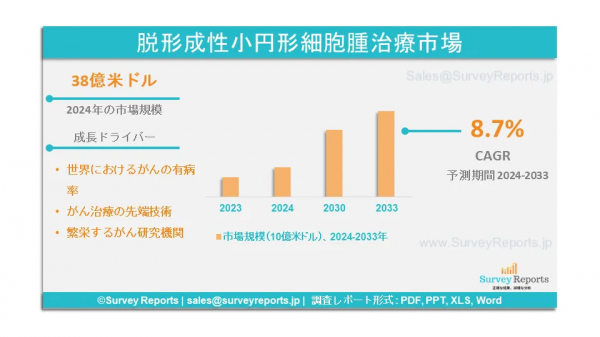 Surveyreportsの専門家らは、脱腫瘍性小円形細胞腫治療市場調査を分析し、2024年に発生した脱腫瘍性小円形細胞腫治療市場規模は38億米ドルであることを明らかにしました。さらに、非腫瘍性小円形細胞腫治療市場シェアは、2033年末までに99億米ドルの感動的な収益を予測する。脱腫瘍性小円形細胞治療市場は、2024年と2033年の予測期間中に約8.7%のCAGRで成長することが提案されています。