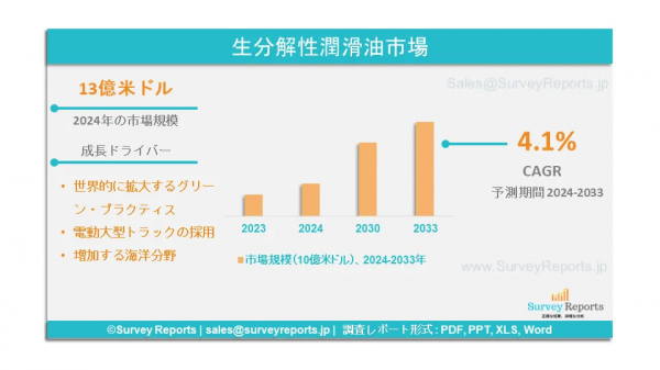 Surveyreportsの専門家は、生分解性潤滑油市場調査を分析し、2024年に生成された生分解性潤滑油市場規模は13億米ドルであることを発見した。さらに、生分解性潤滑油市場シェアは、2033年末までに38億米ドルの感動的な収益を予見する。生分解性潤滑油市場は、2024年と2033年の予測期間中に約4.1%のCAGRで成長することが提案されている。