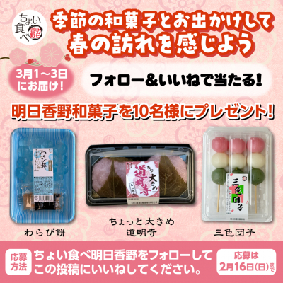 今回のキャンペーンでは、東日本地域の人気商品、2月から販売を開始した看板商品ブルートレーの「わらび餅」をはじめ、桜葉のいい塩梅を味わえる「ちょっと大きめ道明寺」、彩り鮮やかな「三色団子」をセットにして10名様にプレゼントいたします。