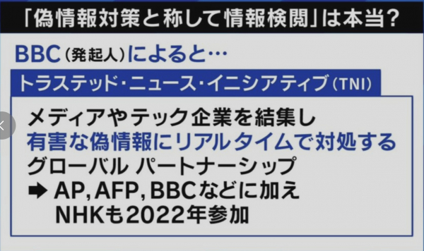 USAIDの資金問題とともに注目を集めているのが、BBC主導で設立された国際メディア団体TNI(トラステッド・ニュース・イニシアティブ)だ。TNIは「偽情報対策」として情報の検証を行う組織で、AP、AFPなどと並び、2022年からNHKも参加している。