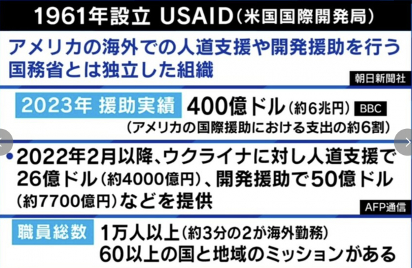 USAIDはアメリカ国務省とは独立した機関で、2023年の援助総額は400億ドル(約6兆円)にのぼる。アメリカの国際援助予算の約6割を占め、特にウクライナには2022年2月以降、人道支援として26億ドル(約4000億円)、開発援助として50億ドル(約7700億円)を提供してきた。