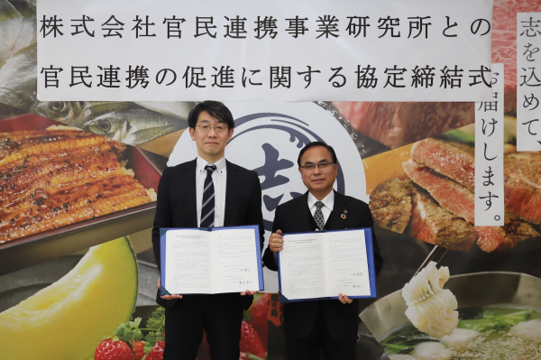 (写真:左から、株式会社官民連携事業研究所 代表取締役社長 鷲見 英利、志布志市 下平 晴行 市長)
