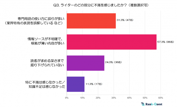また、11.3%(17名)は「特に不満は感じなかった/知識不足は感じなかった」と回答しており、一部ではライターの品質に満足する声もあるものの、改善の余地はまだ大きいと見受けられます。