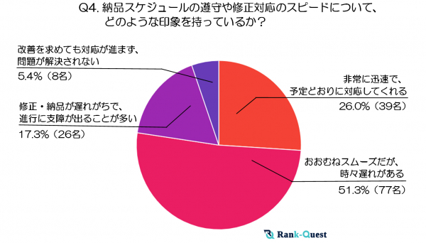 調査結果4:納品スケジュールの遵守や修正対応のスピードについて、どのような印象を持っているか?
