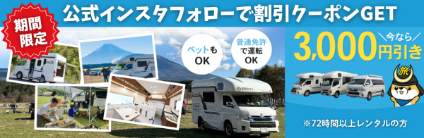 公式Instagramフォロー&コメントでキャンピングカーレンタル3,000円OFFクーポンをプレゼント