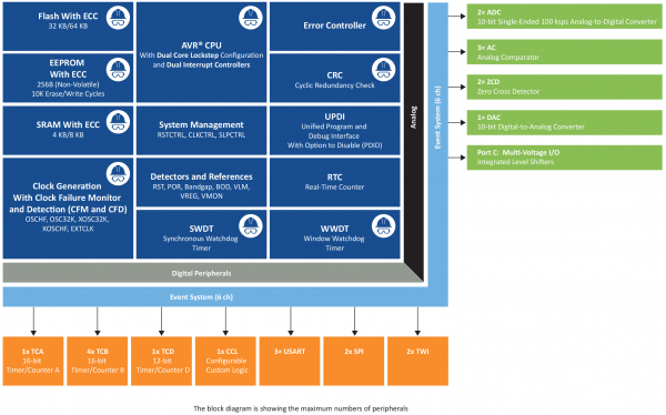ハードウェア安全機能には、デュアルコア ロックステップCPU、2つのADC (A/Dコンバータ)、全てのメモリに対するECC(誤り訂正コード)、専用のエラー コントローラ モジュール、エラー注入メカニズム、電圧モニター、クロックモニターが含まれます。これらの機能により、エラー検出時間が短縮されると共にソフトウェアの複雑さも低減されます。AVR SDファミリは、内部フォルトを迅速かつ決定論的に検出する機能を備えており、アプリケーションはわずか1ミリ秒のFDTI(フォルト検出時間間隔)目標を達成し、危険な状況を回避して信頼性を向上させる事ができます。