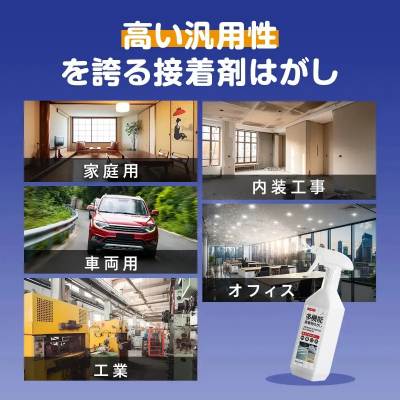 家庭から業務用まで幅広く使え、長年こびりついたノリや粘着剤をスピーディに溶かし、素材を傷めることなく、美しい仕上がりを実現します。