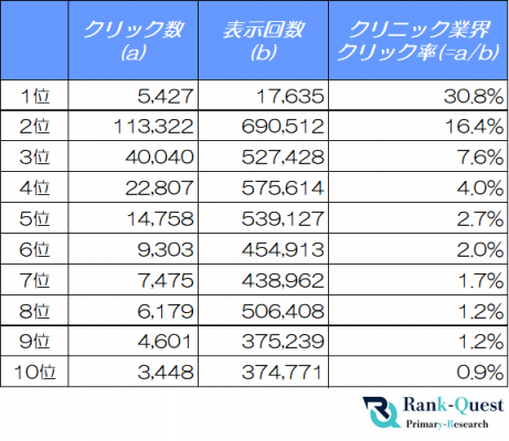 【SEO対策】で検索順位No.1を獲得した(注1)ランクエスト(https://rank-quest.jp/column/column/how-to-seo/ )は、2025年3月にクリニックのクライアントサイトを対象に、検索順位ごとのクリック率(CTR)を計測しました。
